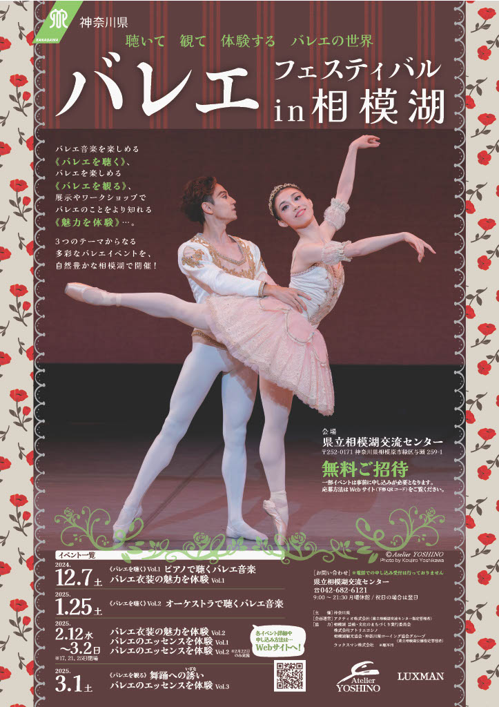 【テストページ】スケジュール 2025 1月25日 (土) バレエフェスティバルin相模湖 オーケストラで聴くバレエ音楽 詳細 開演:13時00分会場:相模湖交流センター料金:招待制主催:神奈川県バレエ組曲「眠れる森の美女」、「白鳥の湖」他